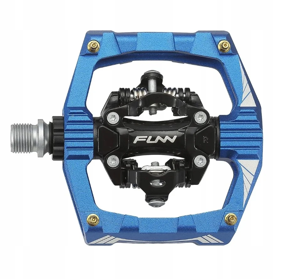 Aluminiowe pedały platformowe RIPPER marki FUNN, z dwustronnymi knagami to wszechstronne pedały rowerowe, ich kluczową cechą jest sprężynowy system zatrzasków kątowych, który znacznie poprawia łatwość zatrzaskiwania się płyt ślizgowych SPD. Podniesiona platforma zapewnia doskonałe wyczucie pedału i wsparcie. Zostały zbudowane na stalowej osi chromowo-molibdenowej z tuleją ślizgową i łożyskiem kasetowym, które mogą przenosić nawet największe obciążenia i są zaprojektowane tak, aby były w pełni sprawne.