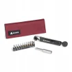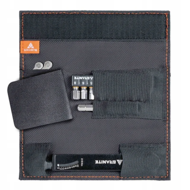 Zawiera 10 bitów o rozmiarach od 2 do 8 mm Hex, T20, T25 i PH2, a także przedłużacz do trudnych miejsc. Zestaw zawiera również elastyczną kieszeń na małe przedmioty i jest umieszczony w wytrzymałej torbie z poliestru 600D z pętlą na pasek nośny Rockband.