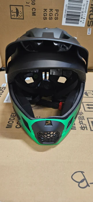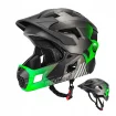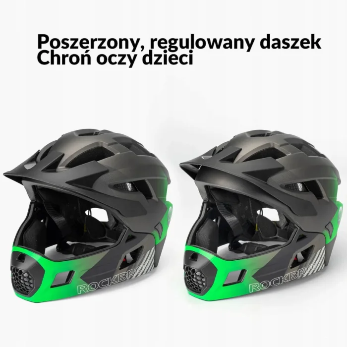 Kask dziecięcy wyposażony jest w zdejmowaną osłonę podbródka, co pozwala używać go zarówno jako kasku pełnego, jak i półkasku. Zapewnia lepszą ochronę dolnej części twarzy podczas jazdy.