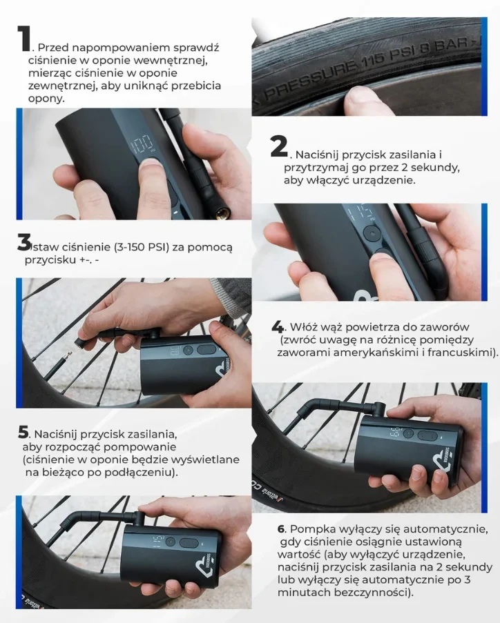 Ustaw żądane ciśnienie, a pompka sama się wyłączy po osiągnięciu poziomu. Oszczędza czas i eliminuje ryzyko przeładowania.