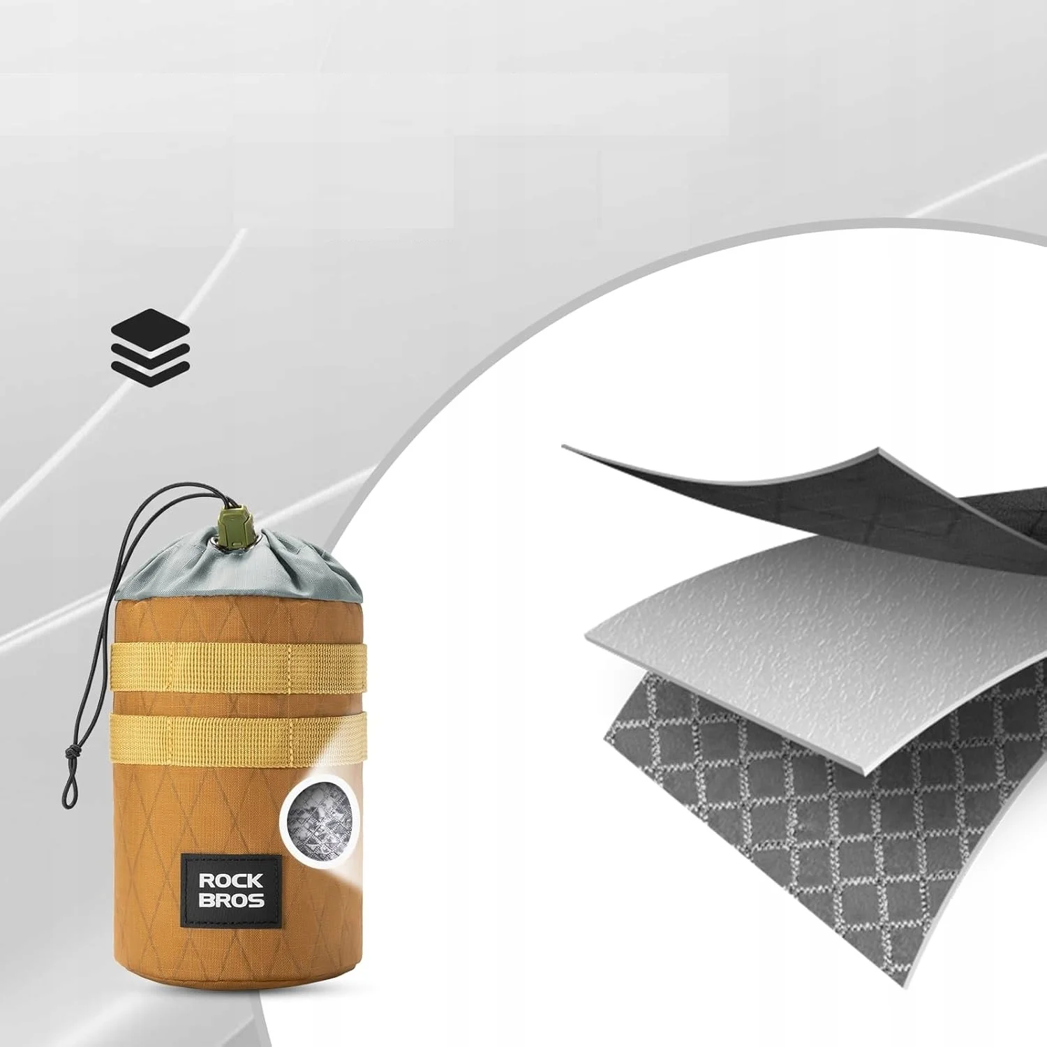 Torba na kierownicę wykonana jest z nylonu i poliestru, dzięki czemu jest elastyczna, wytrzymała i trwała. Ma średnicę ok. 10 cm i regulowany ściągacz, który pasuje do większości butelek na wodę.