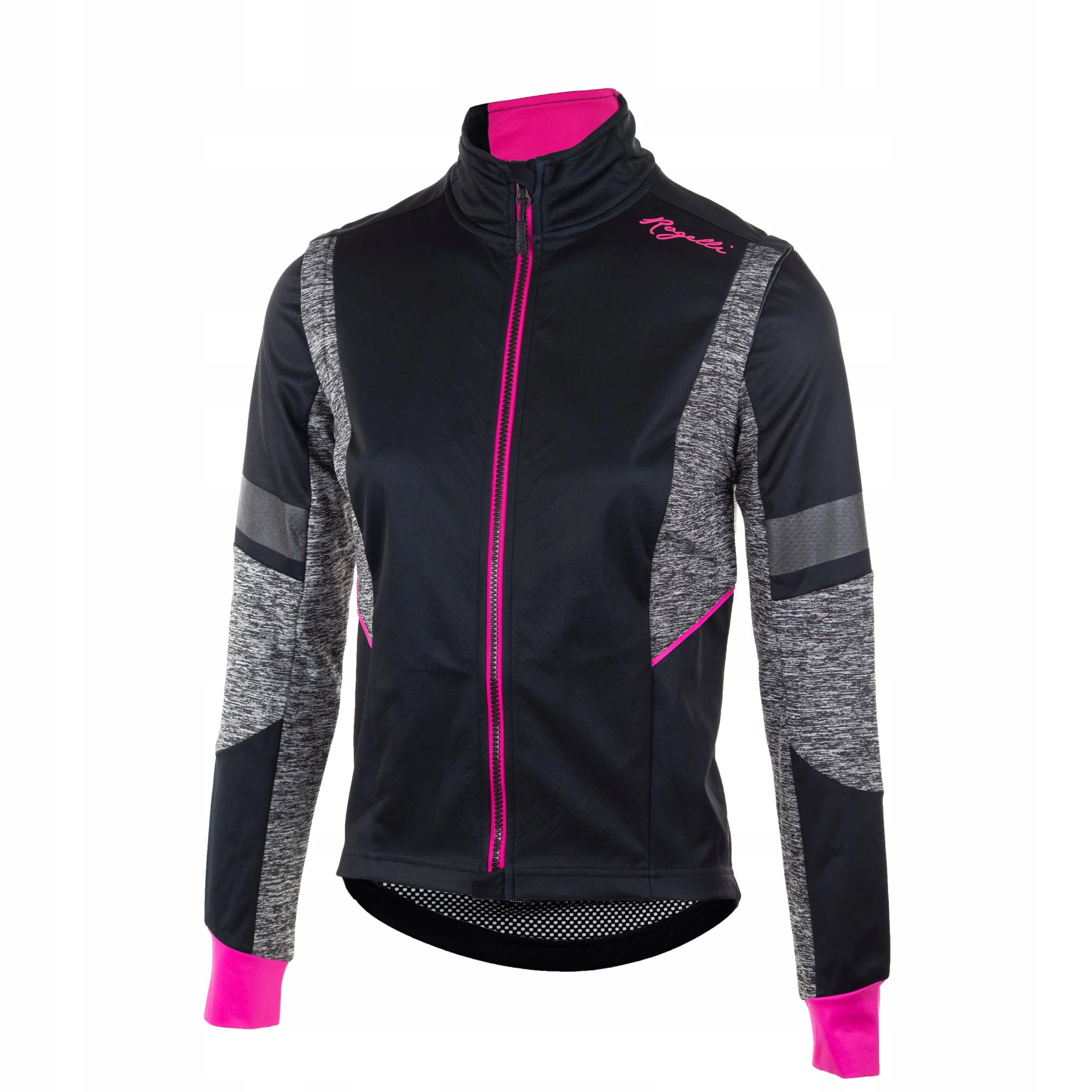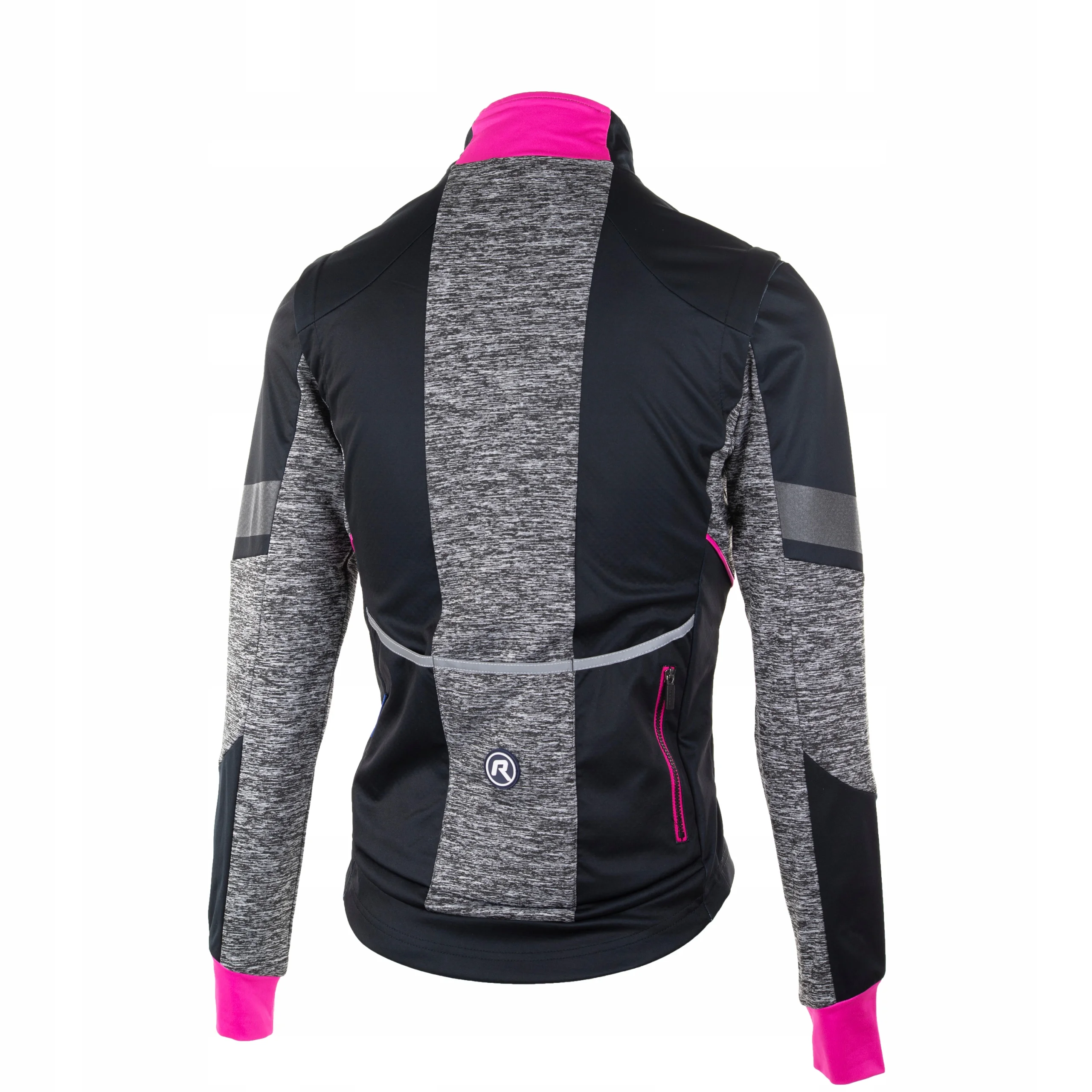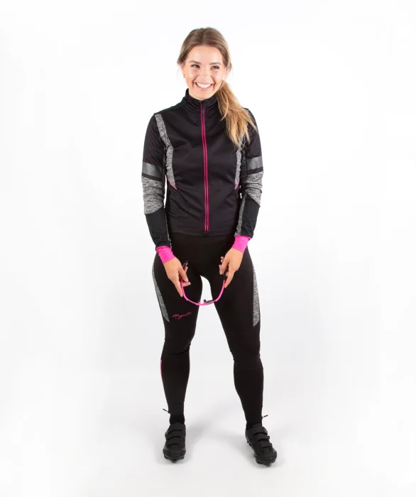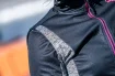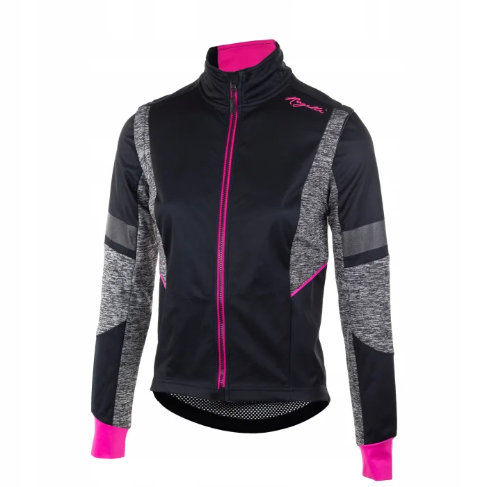Damska kurtka softshellowa Rogelli BLISS z oddychającym panelem tylnym, czarno-szara z różowymi elementami odblaskowymi