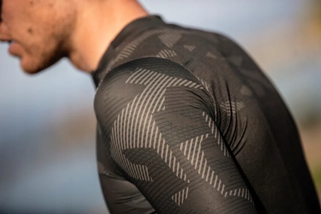 Przepuszczające powietrze panele tylne i boczne z Eco siateczki zapewniają optymalną termoregulację podczas jazdy na rowerze. Ukryty kołnierz płynnie przechodzi w przedni panel, dzięki czemu stylowy nadruk prezentuje się jeszcze lepiej.