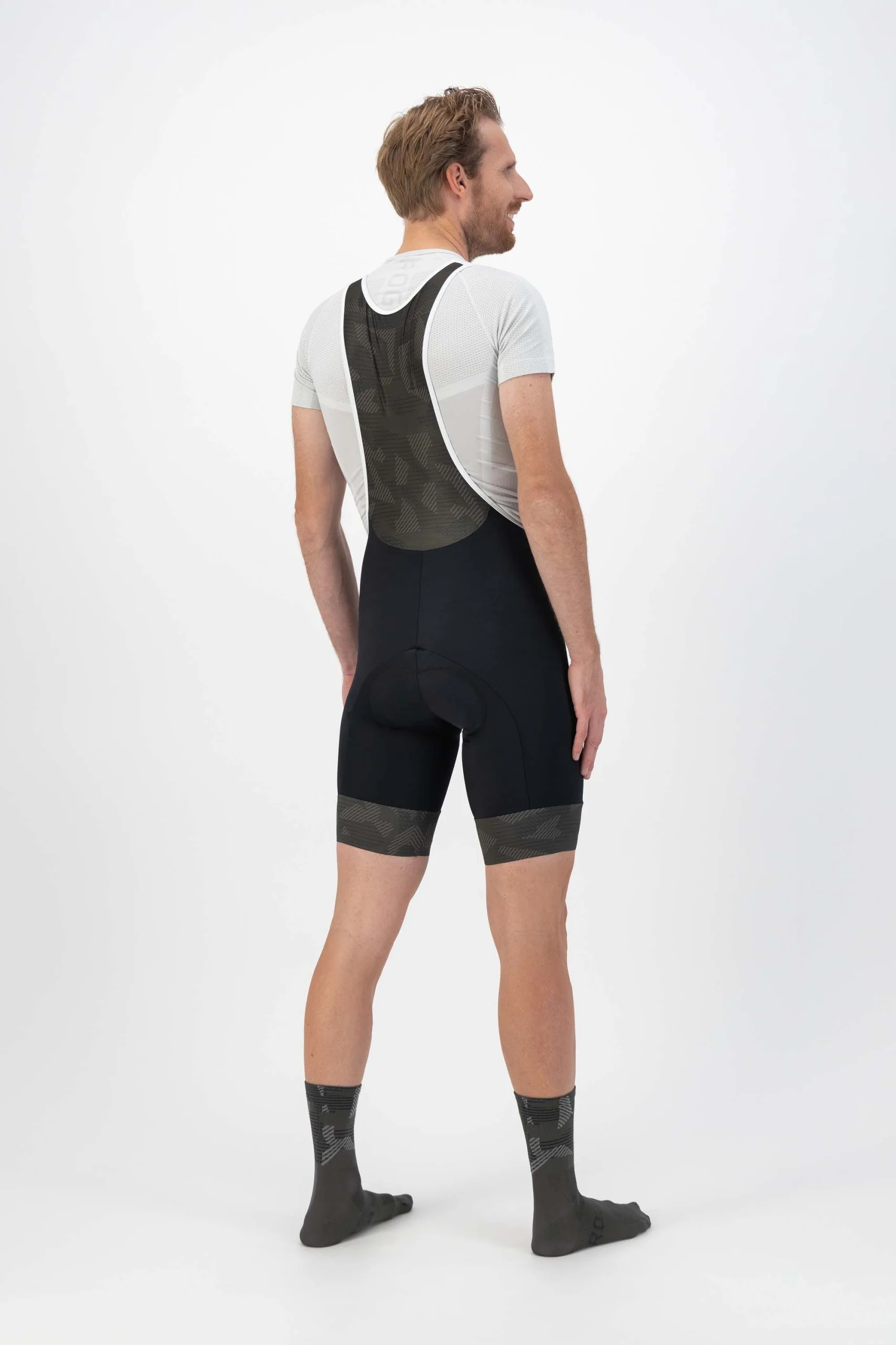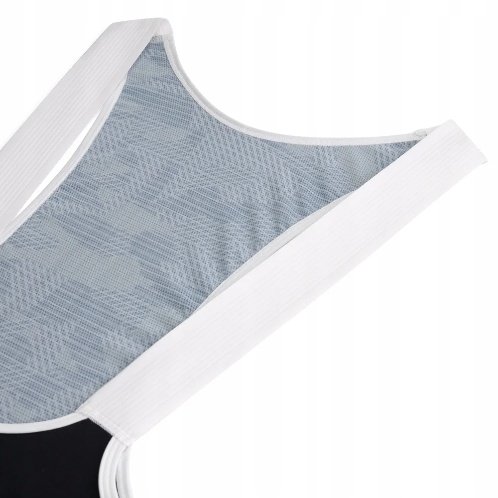 Aerodynamiczny krój spodni Camo został wzbogacony o bezszwowe szelki wykonane z wysoce oddychającej tkaniny Mesh. Tkanina szelek posiada strukturę pionowych pasków, dzięki czemu jest jeszcze cieńsza i lżejsza. Elastyczna, jednowarstwowa taśma wycinana laserowo na nogawkach jest wyposażona w silikonowy pasek od wewnątrz. Kamuflażowy nadruk tych pasków i szelek nadaje spodniom modny wygląd.