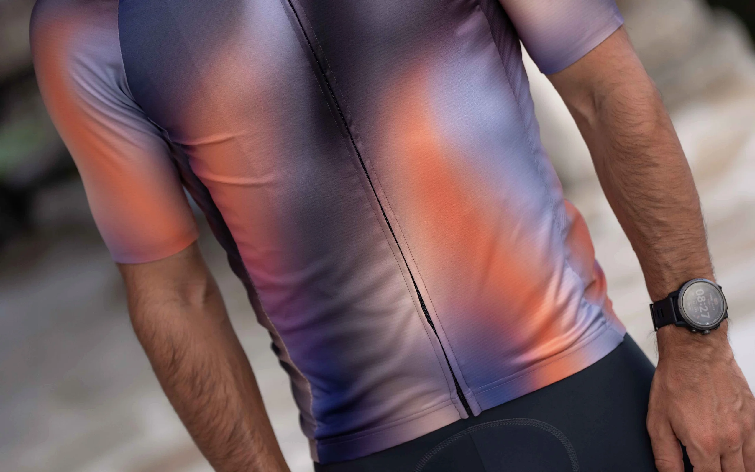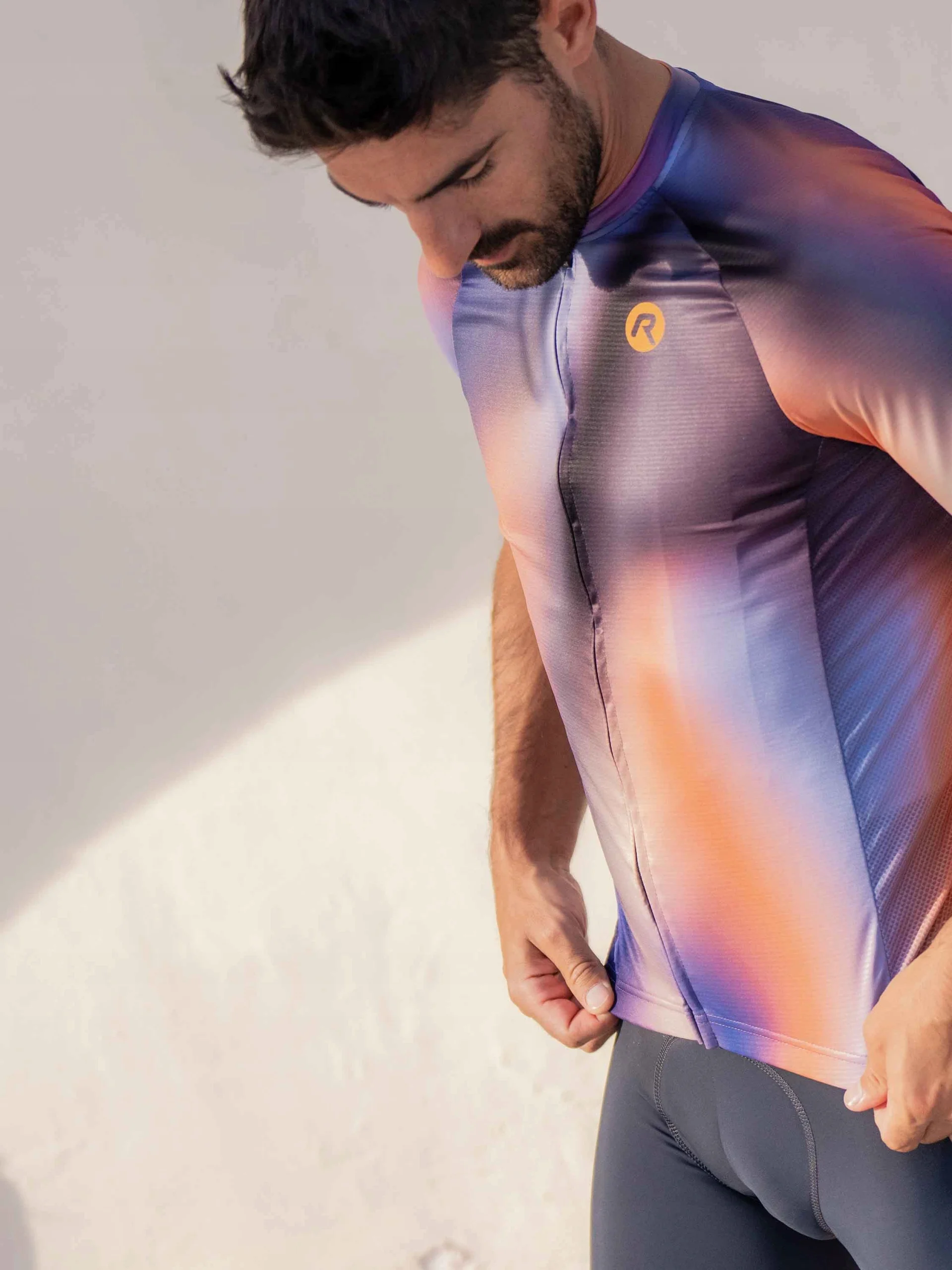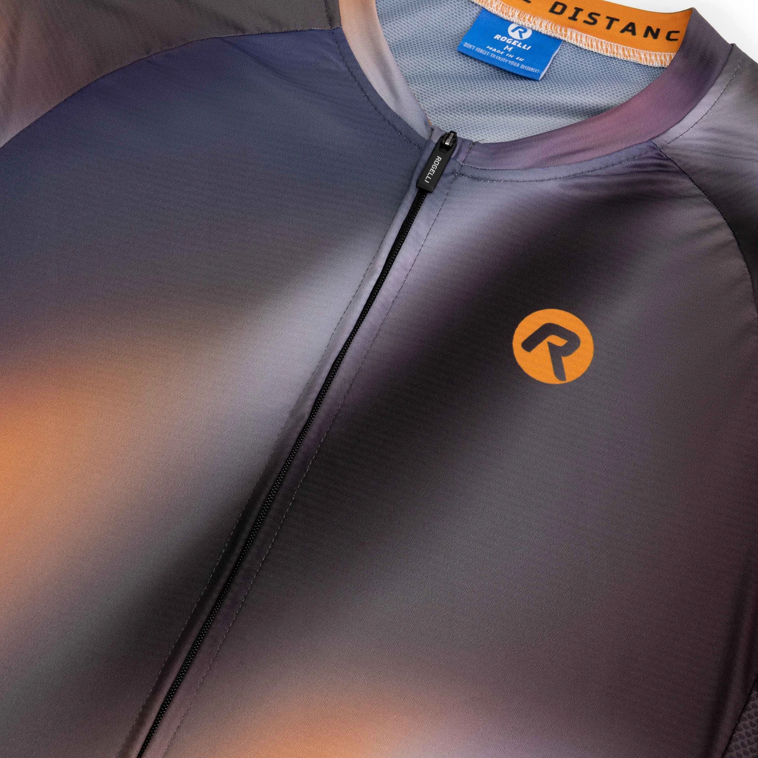 Halo to wysokiej jakości koszulka kolarska ze stylowym nadrukiem, a jej barwny gradient podkreśla nowoczesny design koszulki.