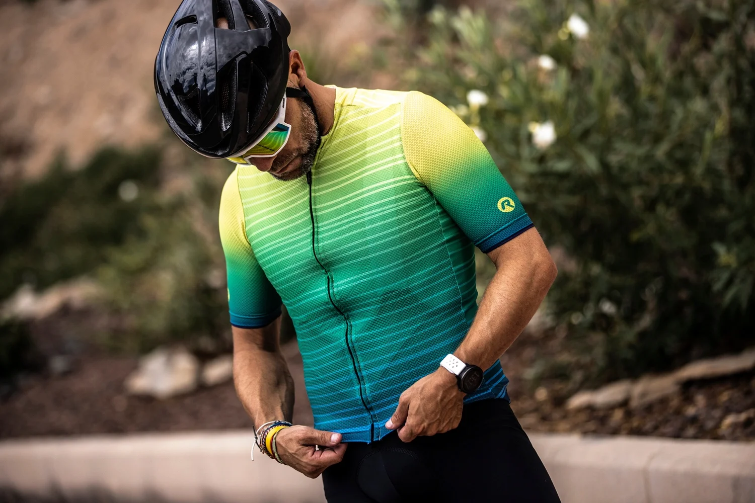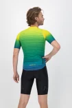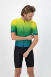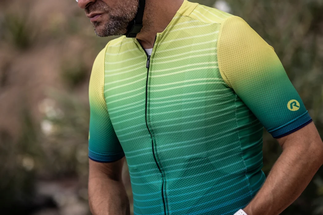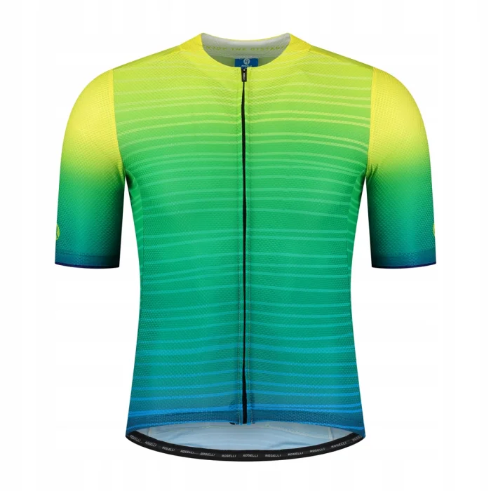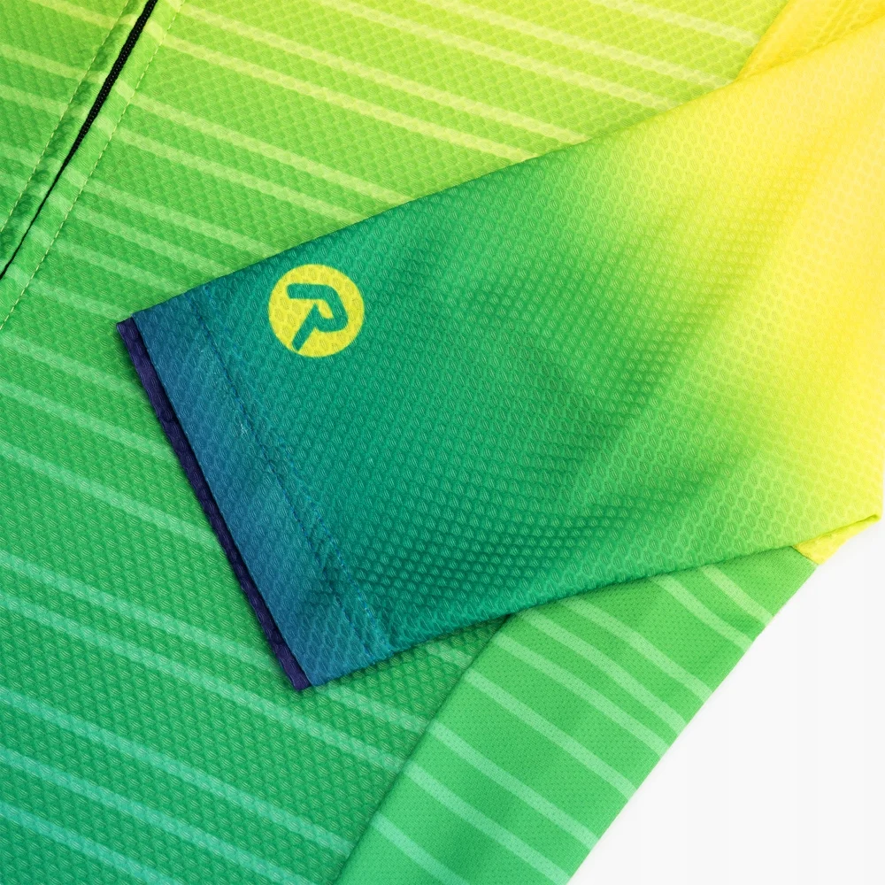 Koszulka kolarska jest wykończona ukrytym zamkiem błyskawicznym i ukrytym kołnierzem, które podkreślają stylowy wygląd koszulki. Ukryty kołnierz płynnie przechodzi w przedni panel z przodu, dzięki czemu stylowy nadruk prezentuje się jeszcze lepiej. Kolorystyka nadruku inspirowana jest letnim zachodem słońca, uwielbianym przez wszystkich surferów.