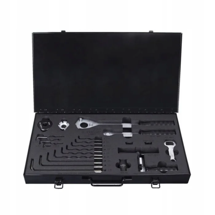 Zestaw na stulecie zawiera narzędzia z aluminiowymi raczkami anodyzowanymi na kolor czarny. Narzędzia są poukładane na piankowej wkładce SOS wycinanej laserowo i umieszczone w żelaznej walizce. W środku znajdziecie specjalnie wyselekcjonowane narzędzia, które pozwolą w większości przeprowadzić proste prace przy rowerze.