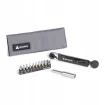 Zawiera 10 bitów o rozmiarach od 2 do 8 mm Hex, T20, T25 i PH2, a także przedłużacz do trudnych miejsc. Zestaw zawiera również elastyczną kieszeń na małe przedmioty i jest umieszczony w wytrzymałej torbie z poliestru 600D z pętlą na pasek nośny Rockband.