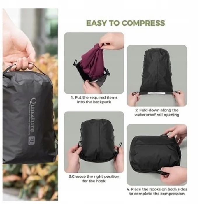 Uproszczony proces kompresji pozwala na łatwe umieszczenie, zwinięcie i zabezpieczenie torby – gotowej do użycia w ciągu kilku sekund.