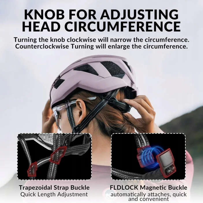 Kask miejski waży tylko ok. 260 g i jest bardzo lekki, dzięki czemu nie powoduje obciążenia ani ucisku podczas noszenia. Magnetyczne zapięcie ułatwia zakładanie i zdejmowanie kasku na rower szosowy. Obwód głowy można łatwo regulować jedną ręką za pomocą regulowanego przycisku z tyłu głowy (rozmiar M waha się od 54-58 cm, a rozmiar L od 58-62 cm).
