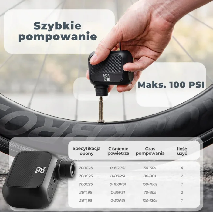 ROCKBROS Minipompa Elektryczna AS110 Przenośna Auto-Wyłączanie 120 PSI Presta & Schrader