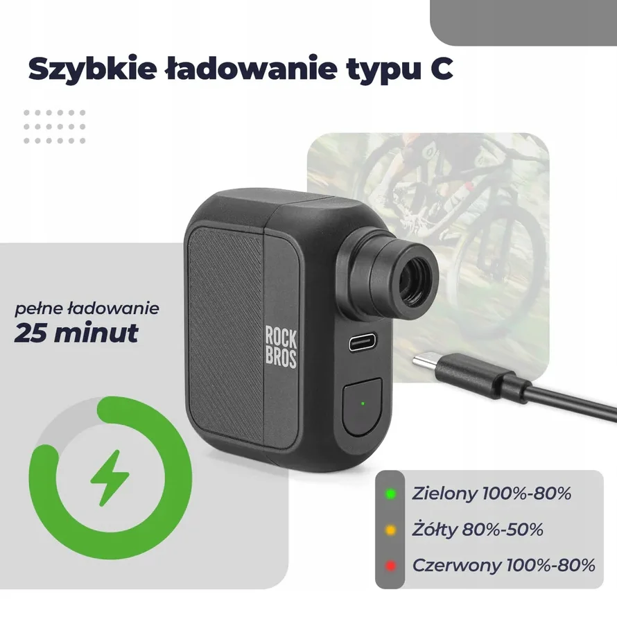 ROCKBROS minipompka elektryczna 120 PSI z inteligentnym wyświetlaczem LED i automatycznym wyłączaniem. Szybkie ładowanie USB-C, kompaktowa i lekka (93 g). Idealna do rowerów, piłek i innych przedmiotów.
