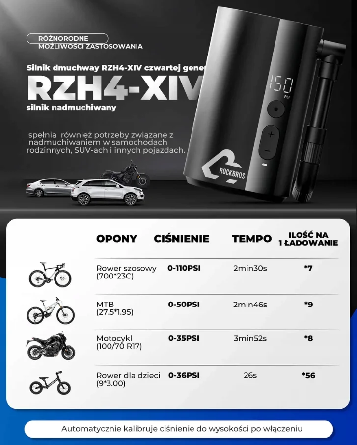 Zastosowanie silnika czwartej generacji RZH4-XIV zapewnia stabilne i szybkie pompowanie. Wydajność do 7 opon szosowych na jednym ładowaniu. System otworów wentylacyjnych chroni urządzenie przed przegrzaniem, gwarantując dłuższą żywotność.
