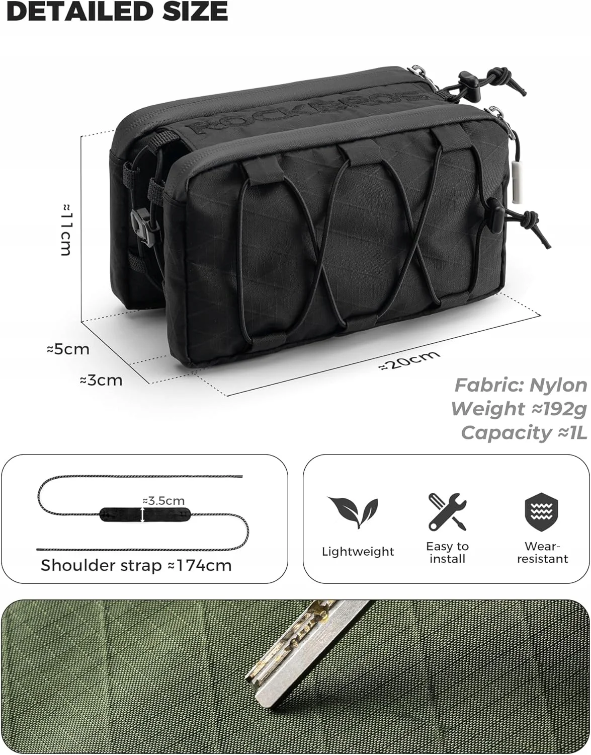 Materiał: Nylon + przekładka z przędzy 1000D o wysokiej wytrzymałości + włókno poliestrowe