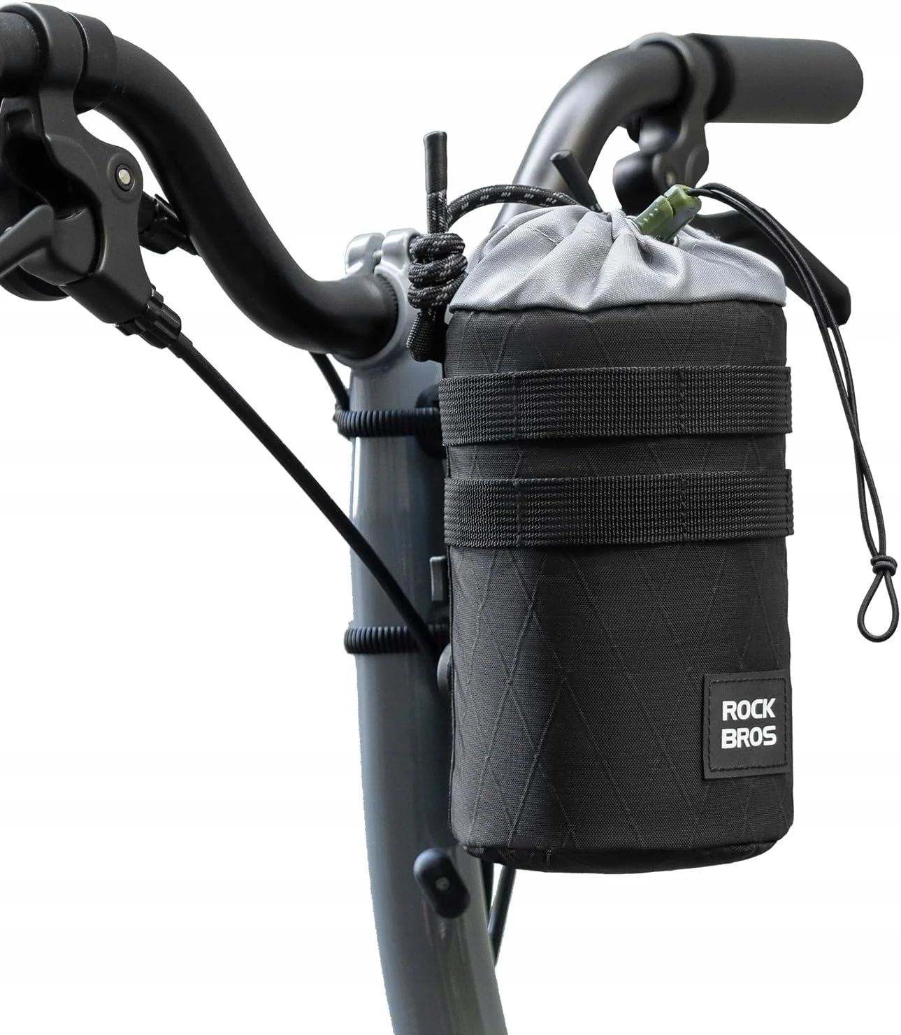 Torba na kierownicę wykonana jest z nylonu i poliestru, dzięki czemu jest elastyczna, wytrzymała i trwała. Ma średnicę ok. 10 cm i regulowany ściągacz, który pasuje do większości butelek na wodę.
