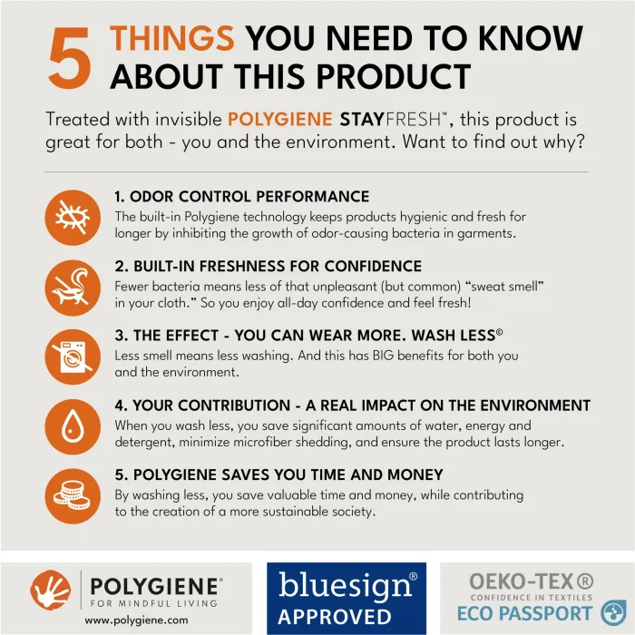 Polygiene StayFresh™ utrzymuje świeżość tego produktu dłużej i zmniejsza potrzebę częstego prania.