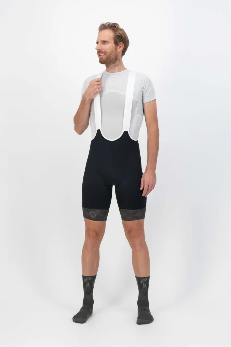 Aerodynamiczny krój spodni Camo został wzbogacony o bezszwowe szelki wykonane z wysoce oddychającej tkaniny Mesh. Tkanina szelek posiada strukturę pionowych pasków, dzięki czemu jest jeszcze cieńsza i lżejsza. Elastyczna, jednowarstwowa taśma wycinana laserowo na nogawkach jest wyposażona w silikonowy pasek od wewnątrz. Kamuflażowy nadruk tych pasków i szelek nadaje spodniom modny wygląd.