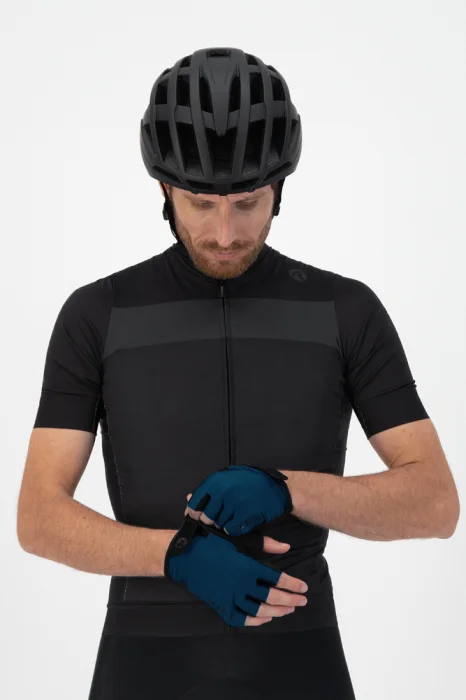 Grzbiet rękawiczki, gdzie połączono materiał Airlite z siateczką, jest ozdobiony odblaskowymi elementami. Część dłoni z wypełnieniem i silikonowym nadrukiem gwarantuje tłumienie wstrząsów rąk w czasie jazdy. Chłonny materiał frotte na kciuku ułatwia ocieranie potu podczas jazdy. Regulacja nadgarstka na rzep i sznureczki pomiędzy palcami ułatwiają ściąganie rękawiczek Rogelli.