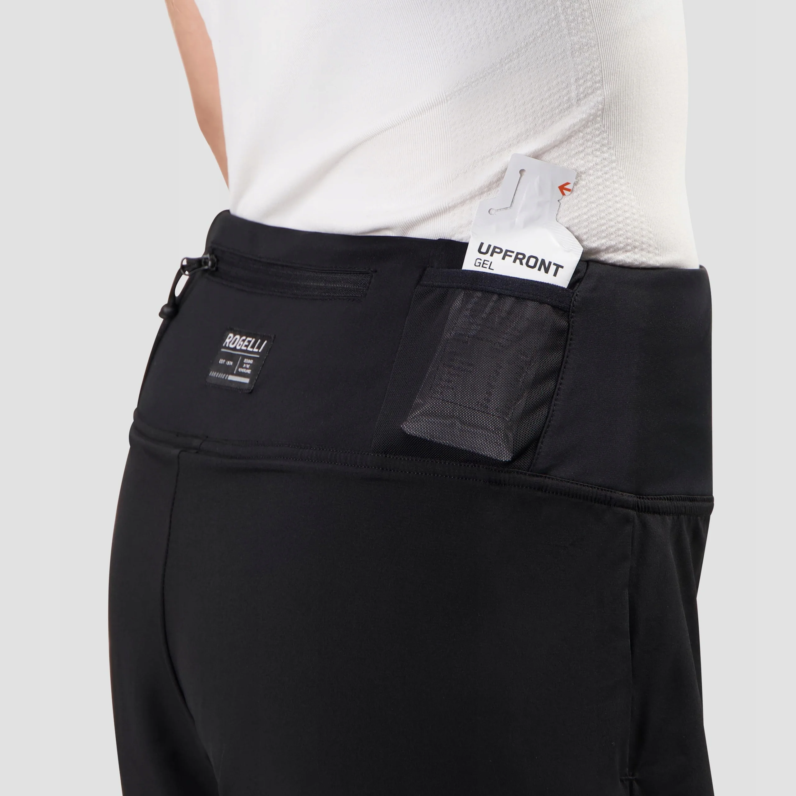 - tylna kieszeń na klucze zapinana na zamek + 2 kieszenie na żele energetyczne na zewnętrznych spodenkach i 2 boczne kieszenie na telefon komórkowy na wewnętrznych elastycznych spodenkach
