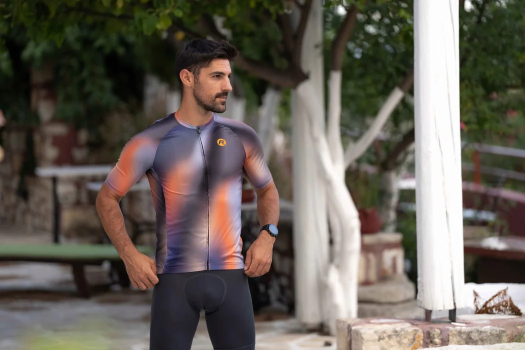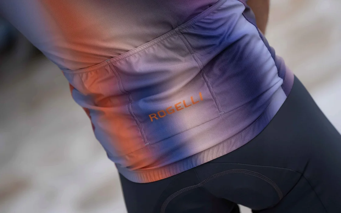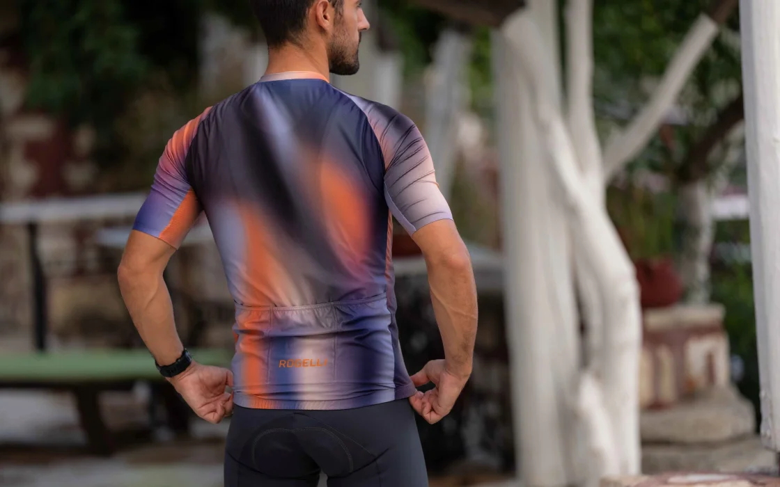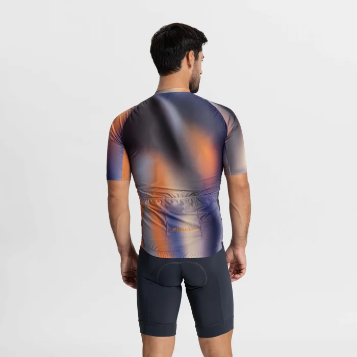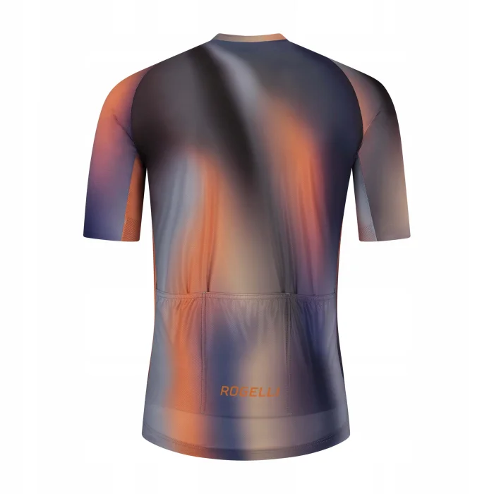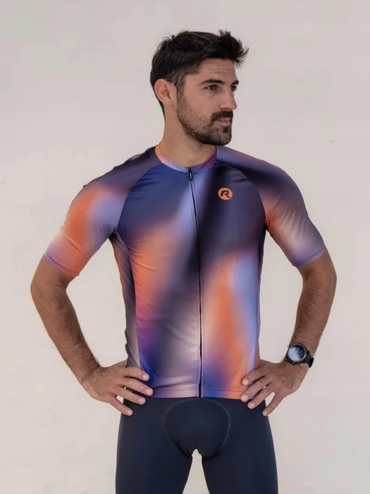 Halo to wysokiej jakości koszulka kolarska ze stylowym nadrukiem, a jej barwny gradient podkreśla nowoczesny design koszulki.