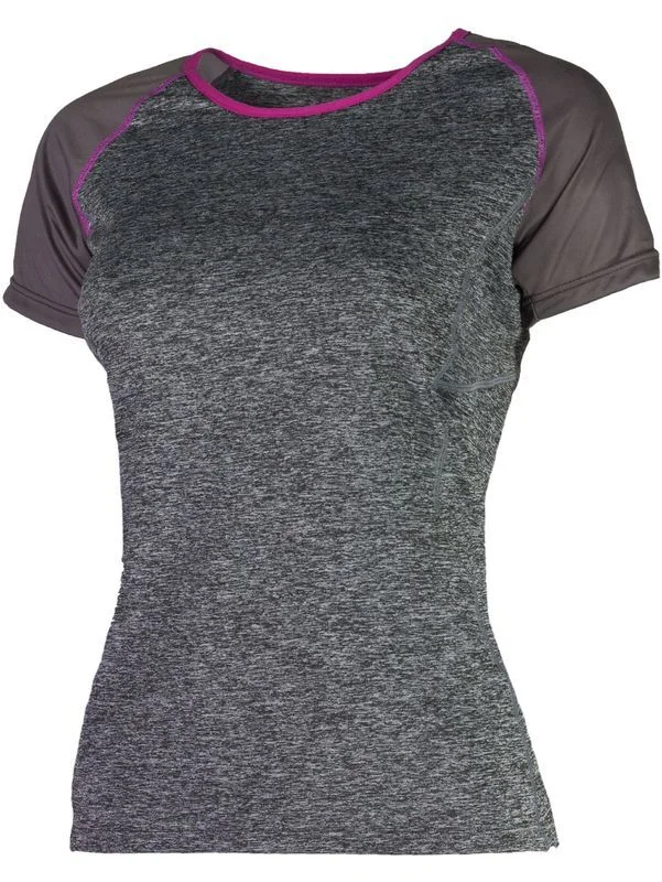 Damska funkcjonalna koszulka wykonana z oddychającego materiału RMX-100. Dopasowany krój z raglanowymi rękawami, klasyczne połączenie dwóch fioletowych odcieni oraz szerszy, okrągły dekolt podkreślają kobiecą sylwetkę. Odblaskowy element na plecach oraz ozdobne odblaskowe logo z przodu wspierają bezpieczeństwo na drodze. Efektowny model, świetnie sprawdzi się w upalne dni podczas uprawiania sportu.