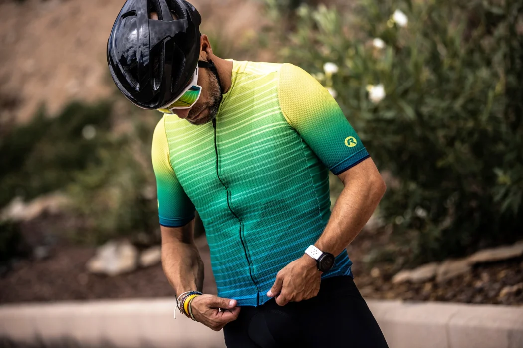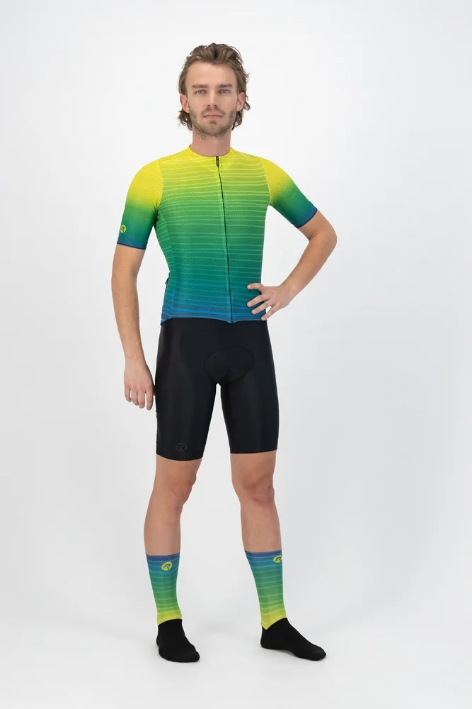 Koszulka kolarska jest wykończona ukrytym zamkiem błyskawicznym i ukrytym kołnierzem, które podkreślają stylowy wygląd koszulki. Ukryty kołnierz płynnie przechodzi w przedni panel z przodu, dzięki czemu stylowy nadruk prezentuje się jeszcze lepiej. Kolorystyka nadruku inspirowana jest letnim zachodem słońca, uwielbianym przez wszystkich surferów.
