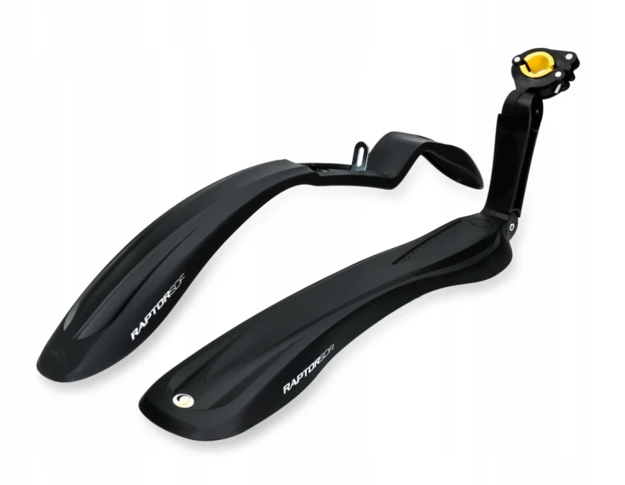 Błotniki RAPTOR jak sama nazwa wskazuje stworzone zostały z myślą o prawdziwych drapieżcach. Już sam ich design powoduje, że serce zaczyna mocniej pompować krew do nóg, a zalety użytkowe tylko podkreślają ich niezbędność w każdym szanującym się rowerze. Błotnik przedni RAPTOR SDF skonstruowany został z myślą o wszechstronnie rozumianej uniwersalności. Możemy zamontować go zarówno do amortyzowanych widelców, montowany jest wówczas na podkowie amortyzatora, jak również sprawdzi się przy klasycznych rowerach. Dodatkowo, tak doceniane przez użytkowników mocowanie SPEEDclick znane z błotnika HAMMER SDF, może również być stosowane jako opcja do montażu błotnika w koronę widelca (istnieje możliwość dokupienia adaptera do rur sterowych 1,5”). RAPTOR SDF podczas jazdy skręca wraz z kołem, dzięki czemu jego płetwa cały czas znajduje się w niewielkiej odległości od opony zapewniając optymalną ochronę podczas jazdy w każdym terenie.
